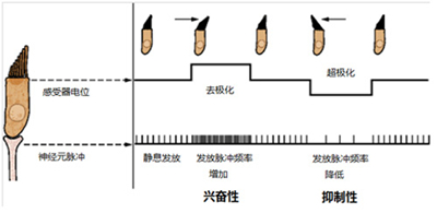 纤毛束的这种不对称排列使得毛细胞具有极性,静纤毛倒向动纤毛使得毛细胞发生去极化(即毛细胞内外的电位差变小),毛细胞释放的神经递质增加,前庭传入神经发放脉冲的频率增加(图七)。类似的,静纤毛倒离动纤毛将降低前庭传入神经发放脉冲的频率。发放频率改变的程度取决于纤毛束的偏折程度。因此,毛细胞可以将纤毛束的偏折方向和程度转化为前庭传入神经发放脉冲频率的改变。