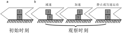 于是,柯克船长和史巴克找来两块积木,非常仔细地将它俩叠在一起,以保证这两块积木的初始运动状态是一样的(图二a),其中“下”被粘在飞船底部,而“上”没有固定在飞船的任何部件,可以“随心所欲”依从自己的惯性。