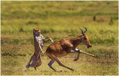 图四,羚羊与猎豹。一步之遥,将决定羚羊是命丧“豹”口,还是绝处逢生。
