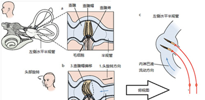 图九,半规管传导旋转加速度。(a)水平半规管在静息时壶腹帽的状态。(b)水平半规管在头旋转时壶腹帽的状态。(c)水平半规管在头旋转时壶腹帽的状态,俯视图。改编自Kandel, E. R., et al. (2000)1。