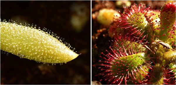 掉落式陷阱具有一个较封闭的水池,能保护自己的猎物不被轻易被盗走。拥有粘胶型捕虫器的植物则完全不同,因而会面临被其他大型昆虫或动物盗走食物的风险,雨水冲刷和大风等因素也会对它逐渐分解吸收昆虫造成影响。别着急,粘胶型陷阱食虫植物的不少种类已经学会了在成功抓到昆虫后通过卷曲叶片和卷须,将猎物紧紧包裹吸收的技能,这个过程通常需要几分钟到几天的时间。其中一些种类,如橡子茅膏菜,捕食昆虫的触须犹如灵巧的开关,能够在瞬间向叶中心卷曲闭合,从而将猎物紧紧包裹住。