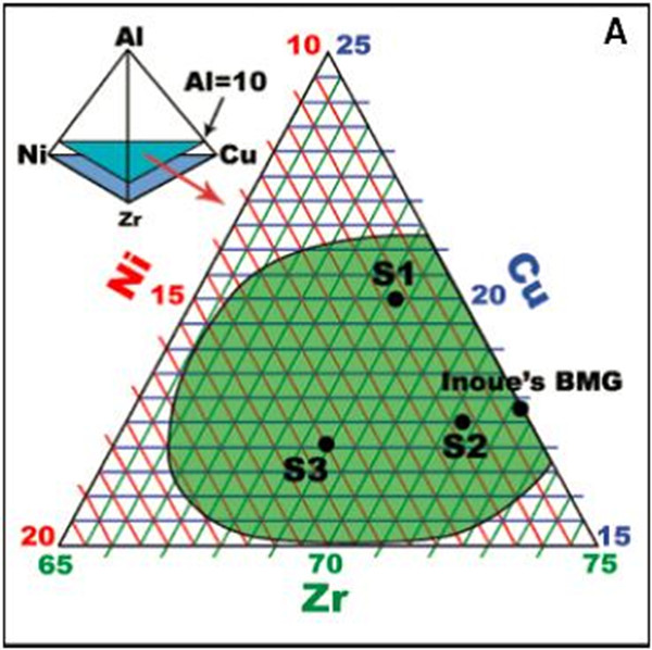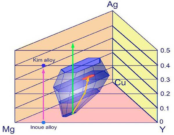 图2. 蓝色区域代表玻璃形成能力为8mm的块体金属玻璃成分分布区。Mg65Cu25Y10 (Inoue alloy, Dc=4 mm)和Mg65Cu15Ag10Y10 (Kim alloy, Dc=6 mm)没有在这个成分范围内。