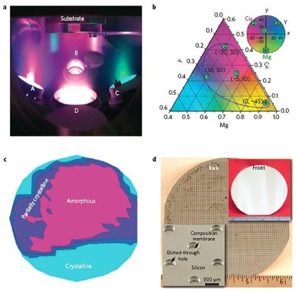 图3. 通过共焦磁控溅射方法和微加工方法制备了一个包含3000个合金成分的薄膜样品“图书馆”。a. 三个直径5厘米的靶材通过直流共溅射的方法制备金属玻璃薄膜样品;正下方还有一个10厘米直径的固定成分的靶材。 b. Mg-Cu-Y薄膜成分相图。 c. 通过X射线衍射方法确定薄膜样品的原子结构。 d. 在Si基片上制备的薄膜样品“图书馆”正反面图片。