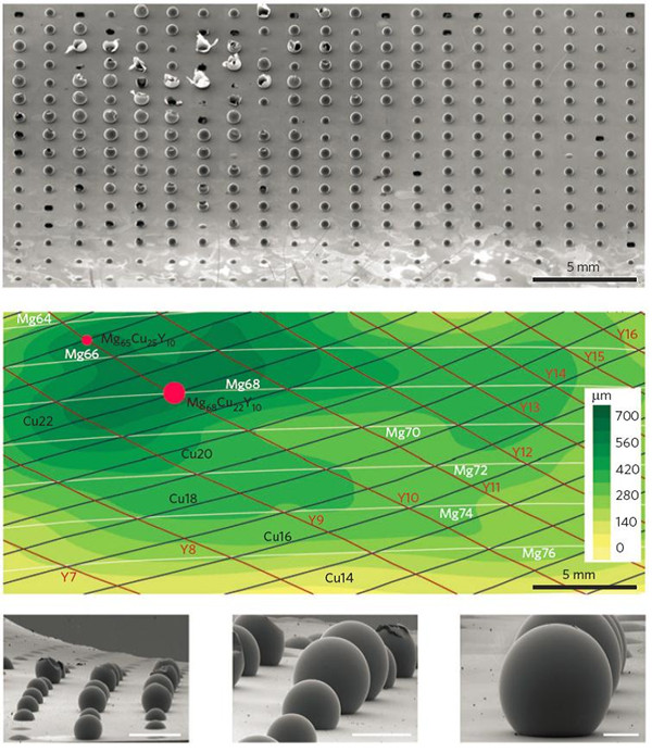 图4. Mg-Cu-Y薄膜图书馆通过同时吹塑方法研究其热塑性变形能力。a. 具有优异热塑性变形能力的区域形貌图。b. 变形后的薄膜高度登高图。c. 热塑性变形能力好的区域的放大图从左到右三张图片的坐标尺分别为1 mm, 500 um, 200 um.