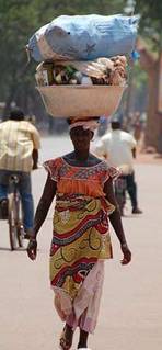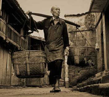 人类在很长的历史演进中,已经学会了在负重时尽量使脊柱作为支柱来承载。如图3、4所示,许多人采用头顶负重,或者用肩挑负重,都是使重物的重力大致是沿着脊柱的轴线方向作用,使脊柱作为支柱,只简单地承受压力。这种负重的办法是很科学的,它既能够承受更多的重量,又能够保护脊柱不受伤害。