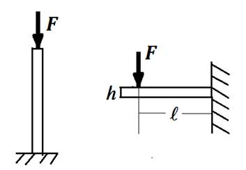 在图2上,左边是一个承受轴向压力的柱,而右边是一根承受横向外力的悬臂梁。它们所承受的外力F是一样大。设这根柱和梁的横截面都是矩形,其宽度是b高为h,而承力点到梁根部的距离为l。此外假设它们都是由同一材料组成的。由材料力学我们知道,两种情形,截面上的最大应力[σ]可以经过简单的计算得到(细节可参阅材料力学教科书)。