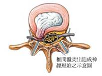 一种是,当人弯腰负重时,所要搬动的物体比较重,超过了人的能力。实际上是背肌不够强,被拉长了,这时脊柱所受的压力是脊柱前边的应力大后部的应力小,椎间盘被挤到后边去,而后边的纤维组织会被压裂而使髓核从脊椎的后方突出。我们知道在弯腰负重时,人脊柱类似于悬臂梁承重,而悬臂梁的应力是它的根部最大,所以这种突出大多发生在脊椎的最后一节上,即第五腰椎上。我们又知道脊柱后面的椎管里有神经,而第五腰椎出发的左右两条坐骨神经分别延伸到左右两条腿上。突出的椎间盘会和某一条坐骨神经相摩擦,使这条神经慢性发炎,这就构成坐骨神经痛。这是一种很常见的劳动损伤,俗称腰腿疼。严重时受伤者只能卧床休息而失去劳动力。前面说的沙叶新的夫人大概就是这种情况。下图5示意椎间盘突出的病变。