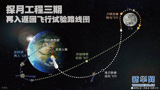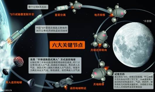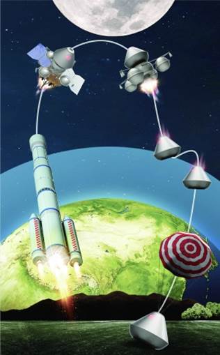 2014年10月24日凌晨2点,作为一个探路尖兵,再入返回飞行试验器“嫦娥5号T1”在西昌卫星发射中心乘坐“长征3号丙”运载火箭发射升空(参见图2),并准确进入近地点高度为209公里、远地点高度41.3万公里的地月转移轨道。除了起飞入轨以外,它还要经历地月转移、月球近旁转向、月地转移、再入返回和着陆回收等五个阶段(参见图3)。2014年11月1日6时42分,“嫦娥5号T1”的返回器在内蒙古四子王旗预定区域顺利着陆,整个飞行历时8天。