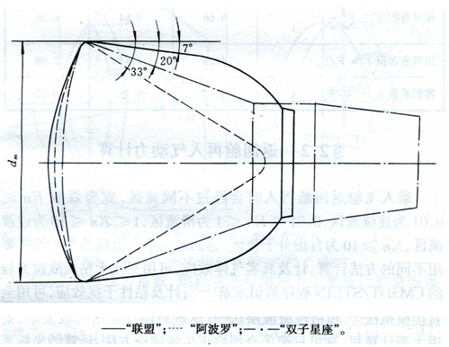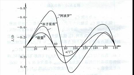 不难理解,这一个“跳跃”动作是生死攸关的一跳!如果跳不起来,“嫦娥”就会一头栽下摔个粉身碎骨;如果跳过了,“嫦娥”就会逃离大气层,无法二次再入而在太空里游荡,既回不了娘家也去不了夫家。这里,选定返回舱再入的位置和姿态是非常关键的。精确可靠地控制返回舱再入的位置和姿态,靠的是掌握高速再入导航制导与控制技术,但是气动学家必须给出保证返回舱安全回地所需要的再入位置和姿态。再入点位置是由轨道决定的,而姿态的确定则要由所需的气动升力来决定。在空气动力学里,飞行器姿态可以用飞行攻角来表示,这里的攻角就是飞行器对称轴线和速度方向之间的角度。图7是科学家计算出的三种球冠倒锥形返回舱的升阻比L/D随攻角α的变化情况,它们分别是俄罗斯的“联盟”号、美国的“阿波罗”号和“双子星座”号(参见图8)。可以看出,“嫦娥”的外形和“联盟”基本一样。图7的曲线告诉我们:返回器在零攻角飞行时没有升力;在某些攻角范围内升力为负值,它就不能起到平衡地球引力的作用。因此,返回舱一般都是采用负攻角的配平姿态,使得升力为正值。有关的研究表明,小升阻比返回舱的形状以球冠倒锥形为最优,它们的最大过载和最高热流也能满足要求。所以,中国的“神舟”号和“嫦娥”号与俄罗斯的“联盟”号、美国的“阿波罗”号和“双子星座”号一样,返回舱都选用这种形状。