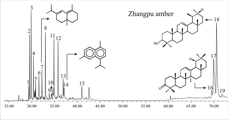 我国河南西峡和福建漳浦都具有悠久的琥珀开采历史,其琥珀原料一直作为一味重要的中药,因此具有重要的经济价值。但迄今尚未有研究关注西峡琥珀和漳浦琥珀的植物来源。近期南京古生物所史恭乐博士、王博博士与印度理工大学孟买校区以及中国科学院西双版纳热带植物园等单位紧密合作,用气相色谱-质谱法测定了我国晚白垩世西峡琥珀和中中新世漳浦琥珀的萜类化合物组成。萜类化合物组成显示,晚白垩世西峡琥珀最有可能来源于裸子植物南洋杉科,但不能排除掌鳞杉科的可能性;中中新世漳浦琥珀最有可能来源于热带被子植物类群龙脑香科。此前在漳浦产出琥珀的地层中已发现了大量龙脑香科的翅果和叶化石,这与漳浦琥珀生物标志物研究得到了相互印证。