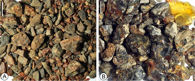 图1. 西峡琥珀(A)和漳浦琥珀(B)