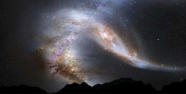 从今天算起大约39亿年后,银河系(右)和仙女座星系(左)将会相撞。现在,巨大的潮汐力已经使两个星系的外侧旋臂翘曲。(图片来源:NASA/ESA/Z. LEVAY AND R. VAN DER MAREL(STScl)/T. HALLAS/A. MELLINGER)