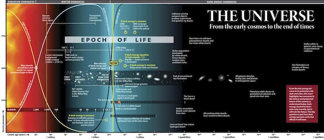 根据现有知识,上图标出了宇宙从炽热的年少时期走向冷寂的生命终点过程中的几个关键时刻。 虽然暗能量直至最近才开始发挥主导作用,但它却决定着宇宙的未来。最重要的问题是暗能量如何行为,以及它会带来什么影响。(图片来源:ASTRONOMY: ROEN KELLY, AFTER FRANCIS REDDY)