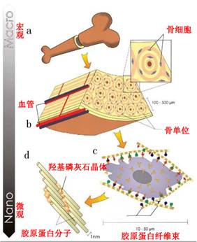 人体骨仿生再生材料是指在体外模拟天然骨的形成环境,通过纳米技术获得与天然骨中尺寸相同的纳米羟基磷灰石晶体,并与胶原蛋白复合,在不同尺度上(微观和宏观)实现成分、结构和功能逼真与人体天然骨的新型复合材料。从高分辨电子显微镜和原子力放大镜分析,人体骨骼有一套非常精巧的结构:一束束胶原蛋白与一层层纳米级羟基磷灰石晶体,极为均匀、有序地“镶嵌”在一起,如图2所示。这种多层复合的自组装结构,也让骨骼兼备硬度和抗弯能力,因而模仿人体骨的这种特殊的结构组成理论上可以达到与人体骨相匹配的生物活性和力学相容性。除此之外,胶原蛋白的存在使得这种仿生的骨替代品易于与自体骨组织的快速粘结。目前关于这一方面的研究仍在进行中,由于外界很难精确模仿体内的成骨环境,人体骨仿生的难度仍然很大。由于骨骼中皮质骨和松质骨所承担的作用不同,其在结构组成上仍有些许差别,这无疑也增加了骨仿生的工作量和难度。