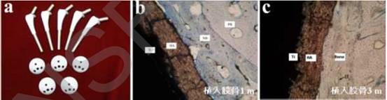 图1. 部分临床应用的羟基磷灰石涂层骨替代材料与体内成骨实验。(a)羟基磷灰石涂层人工髋关节;(b)植入1月后,新骨生成并填充涂层与骨组织之间的孔隙;(c)植入3月后,新骨被成熟的骨组织替代。