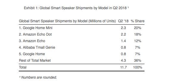 据 Strategy Analytics 最新报告,2018 年第二季度,全球智能音箱销量达 1170 万台。而在销量排行全球前五的榜单里,占主导的还 Google Home Mini、Echo Dot 和 Echo 等入门款和基础款音箱。