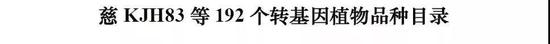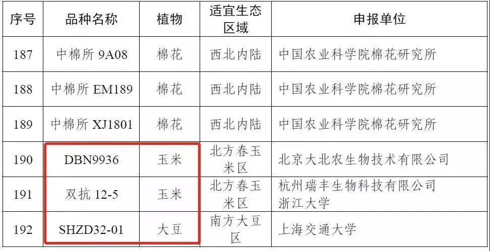 2019年12月30日,农业农村部科技教育司发布《关于慈KJH83等192个转基因植物品种命名的公示》,拟批准为192个植物品种颁发农业转基因生物安全证书目录,其中包括2个玉米品种和1个大豆品种,这是距2009年2个水稻1个玉米获得转基因生物安全证书之后,又有中国研究的主要农作物获得转基因生物安全证书。