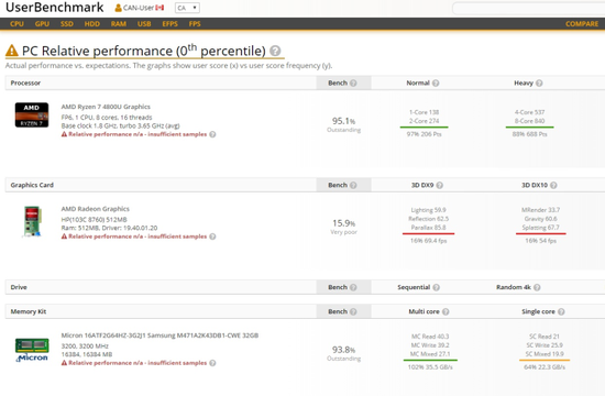 近日,UserBenchmark数据库里又出现了一款更高端的“锐龙7 4800U”,同样是8核心,但使用了16线程设计。不过,锐龙7 4800U的频率偏低一些,基准为1.8GHz,动态加速平均3.65GHz,锐龙4 4700U最高频率能达到4.2GHz。性能表现也令人震惊,单核138分、多核1074分,Intel目前旗舰级的标压版8核心16线程i9-9980HK也不过才分别128分、1101分,i9-9980H则是124分、1000分。