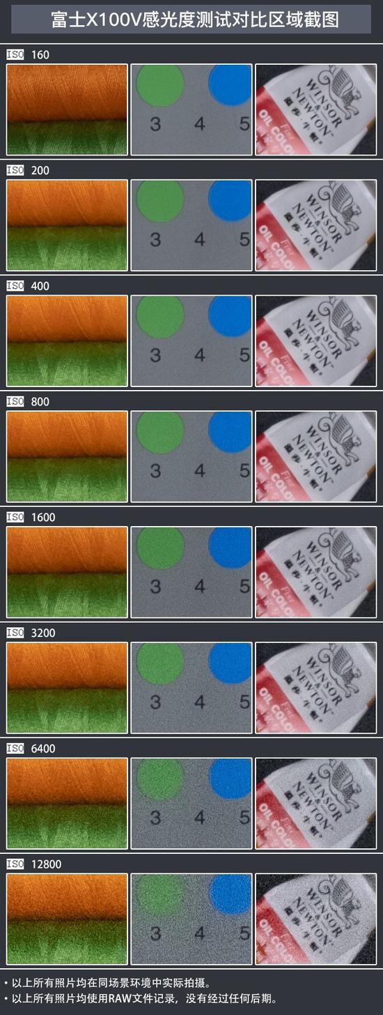 接着我们来看看富士X100V的画质表现,我们使用三脚架固定相机,相同光源,光圈F8、快门速度随着ISO逐级变化,保证曝光亮度一致。
