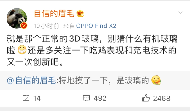 已知 OPPO Ace2 重量为 185g,在旗舰 5G 机型中属于轻薄类型。此前有传闻 OPPO Ace2 采用全塑料机身,今天 OPPO 副总裁沈义人在微博公开表示:「就是那个正常的 3D 玻璃,别猜什么有机玻璃啦,还是多关注一下吃鸡表现和充电技术的又一次创新吧。」确认了 OPPO Ace2 后盖为 3D 玻璃材质。