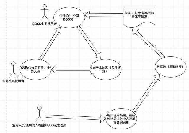 C端付钱的人也是使用的人。同时,这个C的业务可能还不明确。B是付费的人可能不是使用的人。这个业务是非常明确的。那接下来,从这个三角关系(先立个标:为以后同学回顾埋个尸,一但明确了业务关系,其实后边发展与C端其实也没区别)再发展,就是要不断证明你的产品体系是有效的,对业务的推动是有效的。同时,还能更好的节省或创造价值,让B的决策者更愿意继续与你的产品合作下去。