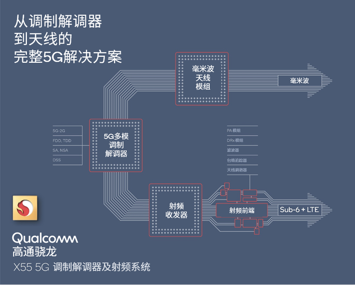 骁龙X55 5G调制解调器及射频系统是旗舰级别的解决方案,集成全球最先进的商用5G调制解调器、射频收发器、射频前端、毫米波天线模组以及软件框架,简单理解,当你如果看到哪一台手机内置了骁龙X55,那么就是说明它拥有业界顶尖的5G网络体验。