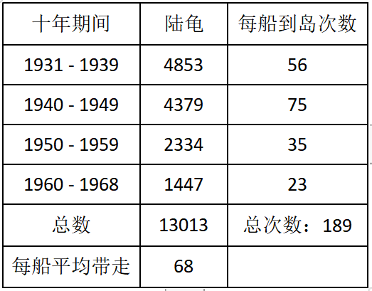 城门失火殃及池鱼:捕鲸船在38年中从加拉帕戈斯群岛捕获的陆龟总数。这仅仅是从美国马萨诸塞州的79艘捕鲸船的航行日志中收集到的数字(还不包括“装满了船”这样的文字描述)。当时全世界一共有七八百艘这样的捕鲸船。引自《加拉帕戈斯群岛陆龟与捕鲸工业的关系》,查尔斯·哈斯金斯·汤森(Charles Haskins Townsend)。