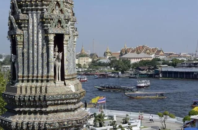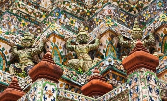 恢宏的郑王寺以印度黎明之神(Aruna)命名。寺庙矗立在昭披耶河(Mae Nam Chao Phraya)西岸,有如花岗岩雕刻而成,从近距离可以看到82米高的雄伟的Ъrang(高棉风格佛塔),它的表面有瓷器碎片组成的马赛克图案。