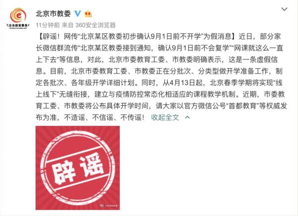 近日,部分家长微信群流传“北京某区教委接到通知,确认9月1日前不会复学”“网课就这么一直上下去“等信息,对此,北京市委教育工委、市教委明确表示,这是一条虚假信息。目前,北京市委教育工委、市教委正在分批次、分类型做开学准备工作,制定各批次、各年级开学详细计划。同时,从4月13日起,北京春季学期将实现“线上线下”无缝衔接,建立与疫情防控常态化相适应的课程教学机制。近期,市委教育工委、市教委将公布具体开学时间,请大家以官方微信公号“首都教育”等权威发布为准,不造谣、不信谣、不传谣!