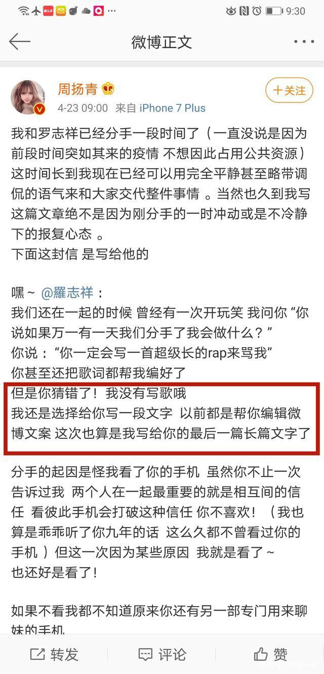 明星分手之后有1万种可以复盘以往感情的方式,说自己分手原因的方法,没想到周扬青和罗志祥说出来的分手理由竟然是如此的不堪。4月23号早9:00,周扬青在自己的社交平台上发了一篇长文,详细解释了她与罗志祥分手的原因。 大意就是:罗志祥出轨,而且是多次,与多人。在周扬青的描述中,她被罗志祥欺骗了整整9年。