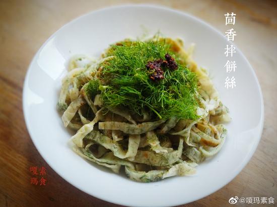 1 茴香少许,洗净分成两份,一份切小段,另一份切细碎。 2 100g中筋面粉加入1g盐、180~200g凉水调成稀面糊(如有筛网可过滤一下),加入细碎茴香静置十分钟备用。 3 锅底刷少许油(油不可多)中小火烧热,倒入1/3面糊,转动锅子让面糊铺满锅底,按自己喜好决定饼子成熟度,我喜欢焦的,嫩的颜色比较漂亮。 4 饼子卷起切丝,加茴香段,油醋汁拌勻即可(醋+香油、花椒油、油泼辣子随你喜欢加) 100g面粉可摊3张饼,饼熟了后可在锅内晃动,不要硬揭哦。饼子形状不用太在意,反正要切碎的