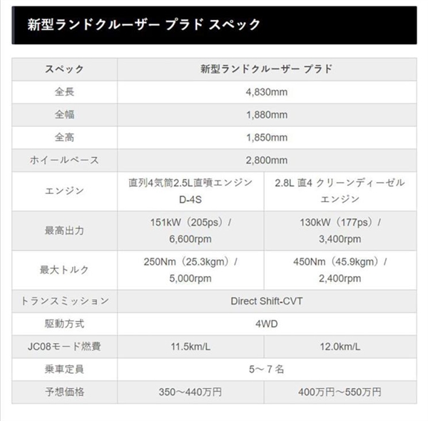 有外媒曝光了一组全新一代丰田普拉多的相关信息。据悉,新车将基于最新的TNGA(GA-L平台)架构搭载,并搭载D-4S直喷发动机,有望于2020年8月发布。 得益于全新平台应用,预计全新普拉多经将用户有更可观的车内空间、更好地空气动力学性能、更好地称身刚度以及更低的车身中心。 参考外媒曝光的资料来看,新车长宽高分别为4830mm/1880mm/1850mm,轴距2800mm,其中长宽以及轴距较现款车型有所提升,而高度稍低。 TNGA另一个最大的好处就是配置,而全新普拉多也会紧跟时代,增加一些电子辅助配置;同时还将全系标配Toyota Safety Sense 2.0系统,包含主动刹车、自适应巡航、车道偏离预警、自适应远光灯等配置。 至于动力方面,根据现有的信息显示,新车提供汽油和柴油发动机可选。其中2.5L直喷四缸发动机最大功率205马力,峰值扭矩250牛·米,百公里油耗8.7L,预计价格在350-440万日元(23-29万人民币左右)之间。 而柴油版车型搭载2.8T涡轮增压发动机,最大功率177马力,峰值扭矩450牛·米,百公里油耗8.3L,预计在400-550万日元(26-36万人民币)之间。 值得一提的是,以上两款车型均匹配CVT变速箱和四驱系统,不过还有待官方验证。丰田表示,他们将会全面改造现款普拉多,让新车更加配得上“硬派越野SUV”这一称号。