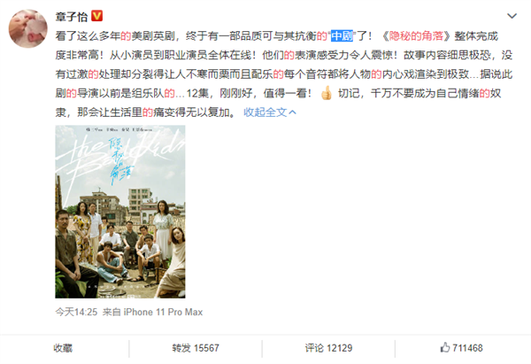 6月16日,国产悬疑剧《隐秘的角落》在爱奇艺开播,目前豆瓣评分9分。 《隐秘的角落》改编自紫金陈小说《坏小孩》,讲述了沿海小城的三个孩子在景区游玩时无意拍摄记录了一次谋杀,他们的冒险也由此展开。扑朔迷离的案情,将几个家庭裹挟其中,带向不可预知的未来...... 电视剧总共12集,有着实力派演员秦昊和王景春助阵,几位小演员挑起大梁,演技超稳,悬疑氛围十足。 近日,章子怡极力推荐这部剧,称之“终于有一部品质可与其抗衡的‘中剧’了”。 章子怡在个人微博发声:“看了这么多年的美剧英剧,终于有一部品质可与其抗衡的“中剧”了!《隐秘的角落》整体完成度非常高!从小演员到职业演员全体在线!他们的表演感受力令人震惊!故事内容细思极恐,没有过激的处理却分裂得让人不寒而栗而且配乐的每个音符都将人物的内心戏渲染到极致…据说此剧的导演以前是组乐队的…12集,刚刚好,值得一看!切记,千万不要成为自己情绪的奴隶,那会让生活里的痛变得无以复加。”