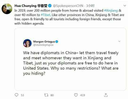 【环球网报道 记者 李东尧】北京时间7月21日晚些时候,中国外交部发言人华春莹连发3条推特。面对美国国务院发言人无端指责中方在新疆与西藏问题上有所“隐瞒”,华春莹用数据进行回击的同时,她还在之后的推文中,质问美国“为什么对中国有这么多的敌意与仇恨?真正恐惧的是什么?”她喊话说:“为了美国人民的生活与未来,停止推卸责任的游戏。” 当地时间7月19日,美国务院发言人奥特加斯先是在推特上声称,“我们在中国有外交官——允许他们在新疆与西藏自由旅行,想见谁就见谁,就像你们的外交官能在美国自由行事一般。为什么有这么多限制?你们在隐瞒什么?” 21日晚些时候,华春莹在推特上贴出奥特加斯这条推文截图,并摆数据回击称,“2019年,来自国内外的超过2亿人次到访新疆,超过4000万人次到访西藏。像中国其他省份一样,新疆与西藏对包括外国友人在内的所有游客都是自由、开放以及友好的,除了那些带着不可告人议程的人。” 接着华春莹在另一条推文中写道:“几十起案例表明,中国学生、学者与科学家在美国受到了系统性的、有针对性的骚扰与压迫,包括强制审讯、随意没收电子设备,甚至肆意扣留。确实,麦卡锡主义又回到了美国。” 随后,华春莹继续写道,“为什么对中国有这么多的敌意与仇恨?真正恐惧的是什么?为了美国人民的生活与未来,停止推卸责任的游戏。”