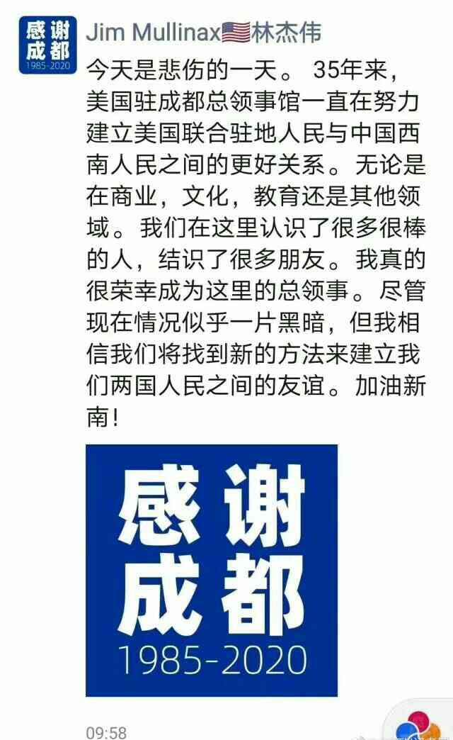 据外交部发言人汪文斌主持介绍,7月21日,美方单方面挑起事端,突然要求中方关闭驻休斯敦总领事馆,对此,中方已向美方提出了严正交涉,要求美方立即撤销有关错误决定,否则中方必将做出正当和必要的反应。7月24日,中国外交部通知美方,关闭美国驻成都总领事馆。 27日上午,美方人员按照中方要求撤离总领馆,美国驻成都总领馆闭馆。中方主管部门随后从正门进入,实行接管。 汪文斌表示,中方要求美方关闭驻成都总领馆并对其实行接管,是对美方关闭中国驻休斯敦总领馆,并强行进入其馆舍这一无理行径的正当和必要反应,符合国际法和国际关系基本准则,符合外交惯例。中美之间出现目前的局面是我们不愿意看到的,责任完全在美方,我们再次敦促美方立即纠正错误,为两国关系重回正常发展轨道创造必要条件。