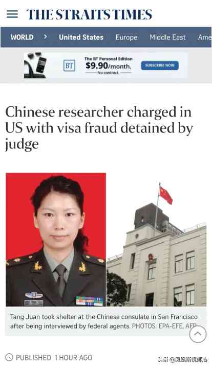 新加坡《海峡时报》官网7月28日报道:一名因”签证欺诈”而被美国羁押的中国研究员,首次在加利福尼亚州萨克拉门托联邦法院出庭(federal court in Sacramento, California)。 报道说,唐娟(Tang Juan, 译名),星期一(7月27日)在美国地方法官狄波拉·巴恩斯(Deborah Barnes)面前出庭受审,并被下令将其扣押至8月10日的听证会,届时她可能寻求保释。 报道说,唐在加州大学戴维斯分校(University of California at Davis)接受联邦探员询问后,曾到在中国驻旧金山领事馆躲避,原因是她涉嫌在服兵役时撒谎。官方还没有解释她上周是如何被联邦拘留的。中国外交部称她的案件是“政治迫害”。