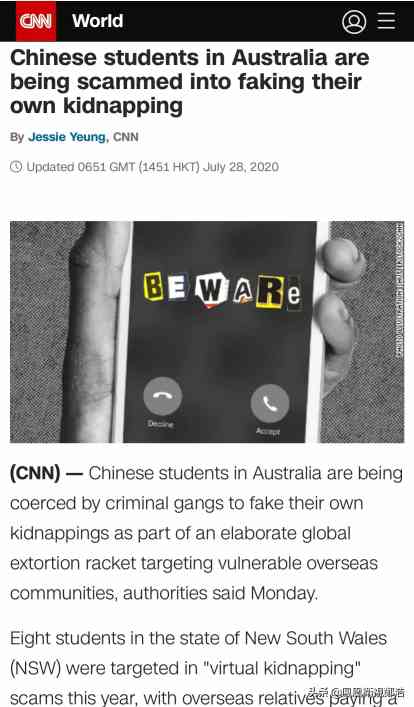 美国CNN电视台官网28日报道:澳大利亚当局星期一表示,在澳大利亚的中国留学生被犯罪团伙胁迫,伪造他们”自己遭绑架”案,以此作为针对脆弱海外社区而精心策划全球勒索活动的一部分。 报道的标题是《Chinese students in Australia are being scammed into faking their own kidnapping》(在澳大利亚的中国留学生被骗假装遭绑架) 报道引述警方一份声明中的话说,新南威尔士州(NSW)8名学生今年成为“虚假绑架”诈骗("virtual kidnapping" scams )的目标,他们的海外亲属共支付320万澳元(约合230万美元)的赎金。 报道说,在一个案例中,悉尼一名22岁女中国留学生的父亲,在收到女儿”被绑在未知地点”的视频后,交出了140多万美元赎金。 报道說,另一个中国家庭通过微信(WeChat),收到了一段他们22岁的亲戚”遭捆绑并蒙上眼睛”的视频,之后支付了14000美元。而新南威尔士州警方却在一间酒店房间”安全地”找到了她。 报道又引述新南威尔士州助理专员彼得·瑟特尔(Peter Thurtell)在一份声明中的话说,学生受害者“因所发生的事情受到伤害,他们认为自己和他们的亲人处于真正的危险之中。” 报道指,新南威尔士州警方表示,骗子的目标是澳大利亚华人社区中的弱势群体(vulnerable members of the Chinese-Australian community),像是那些在陌生环境中远离朋友和家人的留学生。 报道說,今年,澳大利亚约有16.5万名中国留学生,不过由于冠状病毒的流行,人数可能会减少;根据政府的数据,这一数字通常徘徊在20万至21万之间。