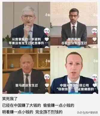 美国国会举行听证会,讨论中国是否侵犯美国企业的知识产权。邀请了苹果、谷歌、亚马逊和脸书的CEO做证。苹果、谷歌和亚马逊都说没有证据证明中国政府侵犯美国企业的知识产权,唯有脸书老板兼CEO扎克指责中国侵犯美国知识产权,但跟美国政府一样,拿不出确凿证据。如果说美国政客攻击中国有政治目的,作为企业家,扎克伯格无端攻击中国,就太无耻了。原因是他一方面害怕中国企业的竞争,第二是他的企业不遵守在中国的政策,没有被允许进入中国市场。他这样搞下去,以后恐怕更不可能进入中国市场了。