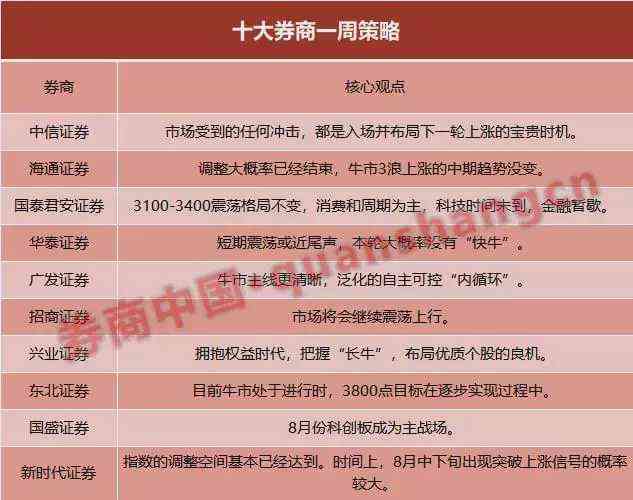 中信证券:有冲击即入场,布局下一轮上涨 预计8月份市场依然处于向上有海外扰动制约,向下有基本面和宏观流动性支撑的均衡状态中;同时,市场流动性整体保持平衡,政策宽松的共识也将重新凝聚。期间市场受到的任何冲击,都是入场并布局下一轮上涨的宝贵时机。 配置上建议关注3条主线:中报季享受高确定性溢价的必选消费、医药龙头;景气持续改善的可选消费板块;美元走弱和供给受疫情影响下,有涨价预期的部分有色金属板块。 海通证券:短期调整结束,中期向上继续 牛市3浪上涨的中期趋势没变,短期调整源于事件性因素干扰,参考历史,调整大概率已经结束。3浪上涨源于资金面+基本面双轮驱动:宏观流动性偏松格局没变,微观资金入市继续,库存周期和政策发力推动基本面回升。这是转型升级牛,科技+券商的主线继续,三季度兼顾基本面回升快的早周期行业,四季度重视低估品轮涨。 国泰君安证券:震荡格局,胜在结构 国泰君安证券认为,需要放下突破的执著。历史筹码密集区域,叠加中美关系不确定因素、宏观流动性斜率放缓、监管态度不确定性等问题,突破3500还需要时间。我们需要对震荡区间的下沿保持足够的信心。中美发酵的路径难以准确预判,但是“以国内大循环为主体”的思维将逐步占主导位置,中美背后的风险评价指标正在经历下行的过程。同时金融服务实体背景下,创业板注册制在即,未来逐季上行的盈利、比市场预期更为持久的宽松流动性环境以及国内资本市场改革预期,均是支撑市场下沿的关键因素。风险偏好因素为主导,那么依靠风险特征选股是个不错的选择。 3100-3400震荡格局不变,后续需要重点关注监管、中美、盈利等因素。风格研判:消费和周期为主,科技时间未到,金融暂歇。行业比较:建材/「机械/食品饮料/家电/汽车/新能源/保险。 华泰证券:短期震荡或近尾声,有“牛”但无“快牛”的判断不变 历史上每轮牛市过程中均出现过缩量调整,但持续时间不长、约1~3周,之后趋势不变。7月下半月A股扛住了流动性冲击、中美关系增压、国内局部疫情反复等压力,在景气数据超市场预期和政策基调稳定之下,华泰证券预计已三周的震荡调整或近尾声。四类无风险利率对应的四类资金入市节奏与历史不同,本轮大概率没有“快牛”;中国即将进入“第二库存周期”和已经处于“第二科技周期”,决定了本轮大概率有“牛”。 继续关注价值股估值修复,继续推荐金融股、地产竣工链、泛科技中与经济周期(居民购买能力和企业IT资本开支能力)相关性更高的电动车、工业互联网等。 广发证券:牛市中期,布局内循环 上周政治局会议定调清晰,一方面货币信用弱双宽的格局延续,基本符合市场预期。另一方面再次明确指出内外局势下要加快形成“国内大循环为主体、国内国际双循环相互促进的新发展格局”。泛化的自主可控“内循环”是未来政策导向和产业趋势主线,牛市主线更清晰。 每一轮牛市都有其主线或者“成长故事”,新冠疫情进一步催化全球政经环境变化之后,“金融供给侧慢牛”的主线更为清晰:泛化的自主可控“内循环”。当前建议继续“估值降维”,在牛市贝塔主线泛化自主可控中寻找估值相对合理的龙头企业,兼顾疫情受损链条业绩修复顺周期中的阿尔法:1.消费内循环(免税休闲服务、小家电);2. 制造投资内循环(军工、光伏、建材、重卡、);3. 科技内循环(金融IT、新能源汽车)。主题投资国企改革(上海、深圳)。 招商证券:市场将会继续震荡上行 进入2020年8月,招商证券预计市场将会继续震荡上行,市场仍处在2019年初开启的两年半上行周期中,逐渐从流动性驱动转为基本面驱动。虽然货币政策宽松程度有所削弱,但当前市场增量资金仍在持续流入。中国经济数据持续改善,企业盈利增速持续回升,即将到来的二季报更多行业将会迎来改善。资管新规推迟,中美科技冲突可能会进入一段时间真空期,有利于风险偏好的改善。市场处在相对友好的金融、经济和外部环境中,8月份业绩公告超预期领域,应该是市场重点发力的领域。但是,需要开始关注股票市场供给加大,减持加大对市场资金供求的边际影响。 兴业证券:拥抱权益时代,把握“长牛” 政治局会议定调下半年政策,持久战,内循环主体,保持定力,聚焦长期,货币政策“量”总量转结构,支持制造业、中小微,“价”明显降低融资成本,下半年重点关注方向。财政政策有望发力“新基建”,产业政策聚焦“十四五”、补短板、锻长板。 此前投资者担忧的政策、流动性等不确定性消除,经济正在由“通缩”转向“复苏”,如果外部波折导致优质股票调整,是拥抱权益时代,把握“长牛”,布局优质个股的良机。 东北证券:3800点目标实现中,消费、科技等是重点 从近期基本面和流动性的变化来看,国内PMI数据显示生产端和需求端的修复持续;目前已披露的中报数据显示业绩回升基本可以确认;货币投放量边际回落,但信用改善持续;微观资金面较前期边际有所改善。因此,目前牛市处于进行时,3800点目标在逐步实现过程中。 从“国内大循环为主体”和坚持结构转型的政策导向下,科技和消费仍是中长期相对确定的主线。同时直接融资作为配套的资本要素需求,券商同样值得关注。 国盛证券:8月科创是主战场 继续看好机构牛、科创牛、科技牛。1)存量资金仍处于低配,增量资金也在