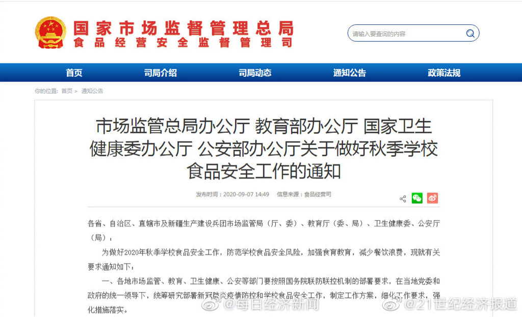 为防范学校食品安全风险,加强食育教育,减少餐饮浪费,国家卫生健康委、市场监管总局、教育部、公安部日前联合公布了《关于做好秋季学校食品安全工作的通知》,其中明确,学校要指派专人或借助学校食堂“互联网+明厨亮灶”,随时抽查食堂食品安全状况,发现问题要及时责令承包方或受委托经营方整改并复查整改结果。(市场监管总局)
