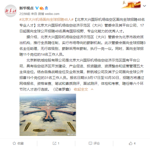 北京大兴国际机场临空经济示范区(大兴)管委会及其平台公司,17日起面向全球公开招聘48名具有国际视野、专业化能力的优秀人才。 据介绍,北京大兴国际机场临空经济示范区(大兴)管委会为北京市政府派出机构,推行全员聘任制,实行市场导向的薪酬机制。此次管委会面向全球招聘3名主任助理,无行政级别,薪酬采用年薪制,执行一岗一议。同时,面向全球招聘11个岗位的14名工作人员。 北京新航城控股有限公司是北京大兴国际机场临空经济示范区国有平台公司,具有临空经济区开发建设、产业促进、投资融资、资源整合和运营管理五大主体定位。结合自身战略定位及业务发展,新航城公司及其子公司面向全球公开招募19个岗位的31名工作人员。报名日期从9月17日至10月30日,招聘方将通过网络报名、资格审查、笔试和素质测评、面试测评、体检和考察、聘任等六个环节对人才进行选拔。