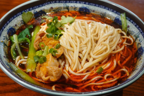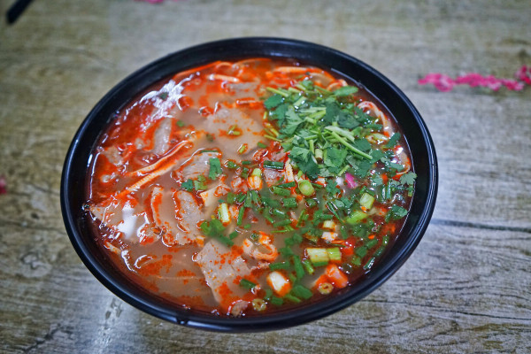 【重庆小面】 从严格意义上讲,小面是一碗没有浇头的素面,面通常是泛着微黄色的碱面,口感筋道爽滑,用骨汤熬煮好的小面加入涪陵榨菜、自贡芽菜、花生、芝麻酱以及油辣子等食材就可以了,面条吸饱了红油、香料的味道,麻辣鲜香、辣而不冲、香味悠长,早上吃一碗这样的小面,一上午嘴巴里都是香的。小面听起来可爱又带亲切,渐渐地很多面店都以小面命名,而且重庆人也开始将重庆面统称为小面,所以现在豌杂面、肥肠面、酸菜面等都被纳入了小面的队列之中。