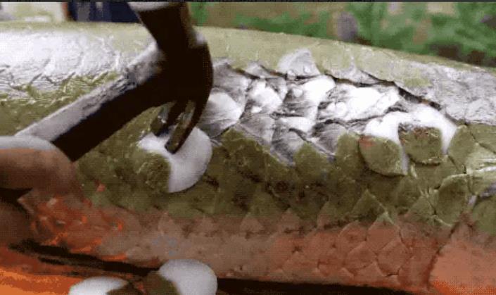 相比于常见淡水鱼那短而薄的鱼鳞,巨骨舌鱼的鱼鳞长度可以达到10厘米,并且分为两层以布林根结构排列。鱼鳞外层富含钙质,硬度和陶瓷相当,内层是胶原蛋白纤维,能有效地减缓冲击力,这也使得它们有着比鳄鱼还高的防御。 在亚马逊流域流域生活的一些土著,常常会将巨骨舌鱼的鱼鳞取下打磨,作为一种便于携带的小刀使用。在面对食人鱼的攻击时,巨骨舌鱼的这层防御堪称“无敌”的存在,想要破防是绝无可能的,食人鱼只能任由巨骨舌鱼宰割。即使我们人类在烹饪巨骨舌鱼的时候,也需要借助铁锤等工具,才能将它们的鳞片敲打下来,因为它们的鳞片,连菜刀都砍不动。巨骨舌鱼的舌中有长出硬骨牙齿,这也使得它们可以轻易地撕碎猎物,它们主要以小鱼为食,但偶尔也捕食蛇、龟、青蛙和昆虫,有时候面对飘落在水面上的植物果实,它们也会将其吞食,甚至一些体型较小的鳄鱼,在遭遇巨骨舌鱼后,也无生还的可能。