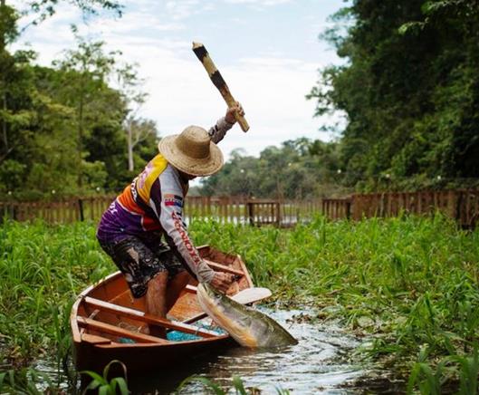 巨骨舌鱼进食的方式和须鲸有点像——张开鱼嘴吸食。 直白一点就是快速张开口腔,从而创造一个真空流,使得食物被吸入。你可别看它们进食的方式有点呆,巨骨舌鱼可是有着一身蛮力的,它们尾部的力量能轻易击碎我们头骨。在亚马逊雨林中,巨骨舌鱼就像是一个移动堡垒,既有着接近“无敌”的盔甲进行自我保护,一身蛮力还能助它们发动强有力的攻击,可谓是结合攻防一体“无敌”的存在。捕捉一条成年的巨骨舌鱼,便能获得近70公斤左右的鱼肉,同时巨骨舌鱼的肉质鲜美细嫩,有着较高的营养价值,在市场上非常的受欢迎,以至于当地人便开始打起了它们的注意。前面说到巨骨舌鱼非常喜欢凑热闹,当地的渔民也发现了这一特点,他们会故意在水面上发出动静从而将巨骨舌鱼吸引过来,跟着再利用木质工具将其敲晕,然后再将其捕获上岸。