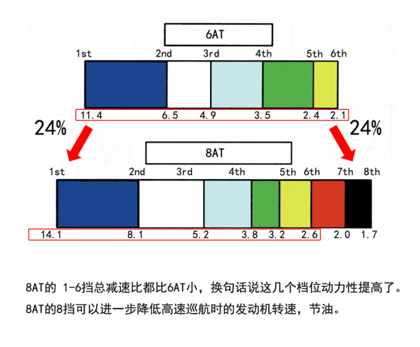 而8AT也有这方面的考虑,8AT最高档位变速比更小,所以在相同车速下如果条件合适的话用最高档位行驶时发动机转速可以进一步降低。比如在高速上车速为120公里/小时,在下坡路段6AT依然要用6挡2200转行驶,而8AT此时可以用8挡行驶,发动机转速只有1800转,这样可以进一步降低油耗。 最重要的是从6AT升级成8AT并不需要额外增加齿轮组,6AT的行星齿轮组数量就足够匹配出8个档位了,只需要对离合器系统和齿轮齿比进行改动就行,所以多出来的档位并不会导致变速箱体积、重量增加,简直是不要白不要。而手动变速箱想要增加挡位必然要增加齿轮和换挡装置,肯定会额外增加摩擦和重量,平时用到的又不多,反而是浪费。