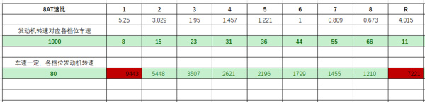 有些人认为8AT就是在6AT的基础上继续增加了两个高档位,其实并不是这样的,因为这样对改变变速箱的性能没有任何意义。比如6AT以前用6挡跑120,发动机转速为2200转,增加两个高档位后可能用7挡跑120发动机转速为2000,用8挡跑120发动机转速为1800,但是这样做意义并不大,因为在日常行驶中可能根本用不到增加的两个高档位。而且就6AT的性能来说应付120的时速已经是绰绰有余,徒增两个高档位没有任何实质意义。而提高日常使用率高的档位的性能反而更重要。这就像修建堤坝,重点是加固低矮的地方,而不是高的地方。而事实上8AT多的那两个档位相当于拆散了安插在各个档位之间了。 我认为对于8AT来说日常行驶中用到最高档位的概率并不大,上图是某配备8AT变速箱的车,根据传动系统参数计算出来的车速与发动机转速对应表,可以看到在车速达到80公里/小时时8挡对应的发动机转速为1210转,理论上来说此时可以用到8挡。但是这个转速下发动机输出扭矩并不是很大,而且8挡变速比又小,扭矩放大倍数很小,如果用8挡行驶的话动力储备会非常小,很可能稍微有点坡度或者稍微踩点油门变速箱就会立马降档,基本上也只能在下坡路段或者匀速行驶时偶尔能用到了。