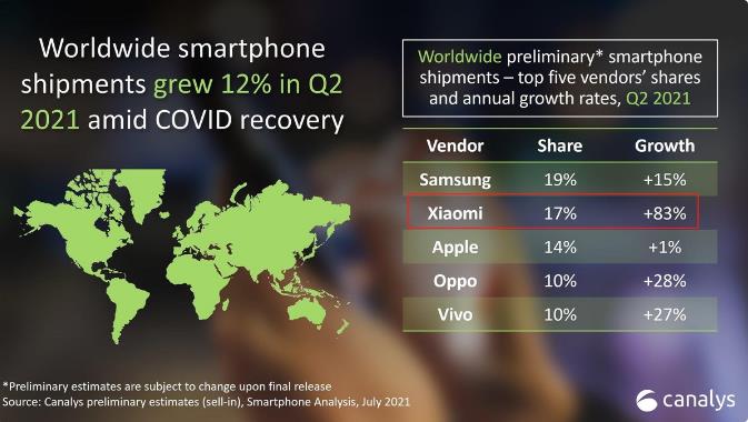 随着全球范围的疫苗推行,全球的智能手机出货量在第二季度增长了12%。小米以17%的份额超越苹果的14%,首次成为全球第二,已经成为今日数码圈最大的热点。除小米外,OPPO vivo也保持了强劲的增长势头,各占10%份额,分列第四第五名。 其实小米在今年第一季度就已经稳居全球第三,并且与第二名的苹果只有1%的份额差距。当时的小米创造了有史以来最好的单季度业绩,出货量增长62%至4900万。只要能保持稳健的增长,超越苹果只是时间问题,果然,这一天比预想中来得要快。