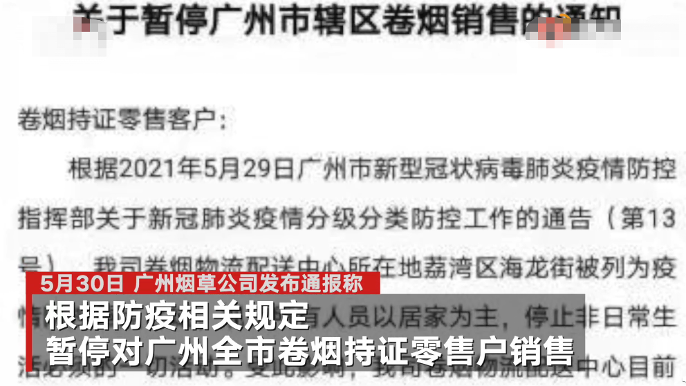 5月30日,广州烟草公司发布通报称,根据防疫相关规定暂停对全市卷烟持证零售户销售。通报称,广州烟草配送中心荔湾区海龙街被列为疫情防控重点区域,无法正常开展卷烟分拣及配送作业,因此暂停全市卷烟持证零售户的销售。目前,卷烟配送恢复时间仍未确定。