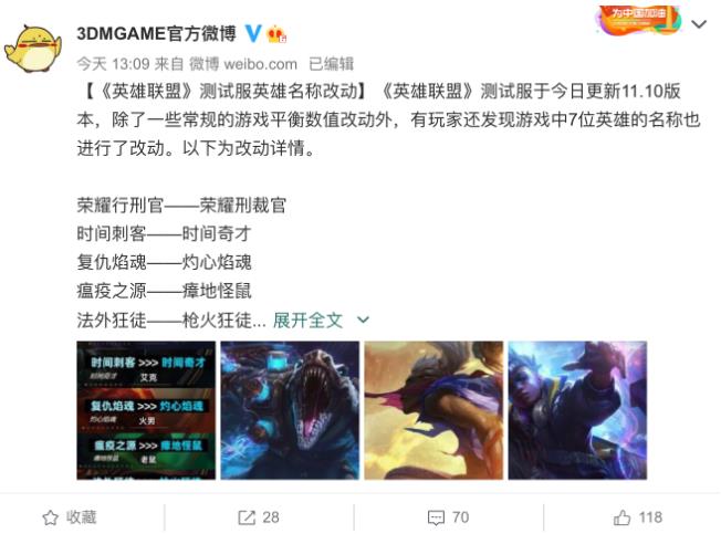 根据游戏媒体 3DM 的报道,《英雄联盟》测试服近日更新 11.10 版,7 名英雄将改名。 《英雄联盟》7 名英雄将改名 荣耀行刑官 → 荣耀刑裁官 时间刺客 → 时间奇才 复仇焰魂 → 灼心焰魂 瘟疫之源 → 瘴地怪鼠 法外狂徒 → 枪火狂徒 虚空掠夺者 → 虚空掠食者 荒漠屠夫 → 荒漠狂沙 《英雄联盟》已经在 4 月 15 日更新发布 11.8 版本,增加了新英雄格温。预计 11.10 版将在不久后更新。