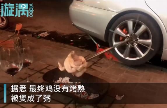 陈女士在朋友的店里吃烧烤时,有一个懂汽修的朋友突发奇想,用一根棍子穿着一只鸡绑在后车轮上,然后发动汽车让车轮转动来做旋转烤鸡。结果创意虽好,但没能把鸡烤熟,最终煲成了粥。